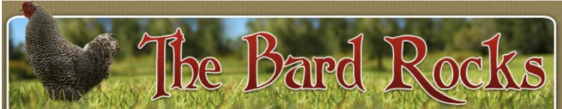 No, The Bard Rocks does not have a thing for chickens, though he has kept them at times. He does have a thing for fun, however. See the hen to the right? What breed is it? Don’t know? (oh, you city people) Barred Rocks, sort of a Plymouth Rock style of chicken, good layers, and also meaty. I can't pass up a double pun. (Does that mean The Bard Rocks is a both good lay... and meaty... oh oh, let's not go there; it's not even punny.) Just for fun, you may hear a chicken song or joke.