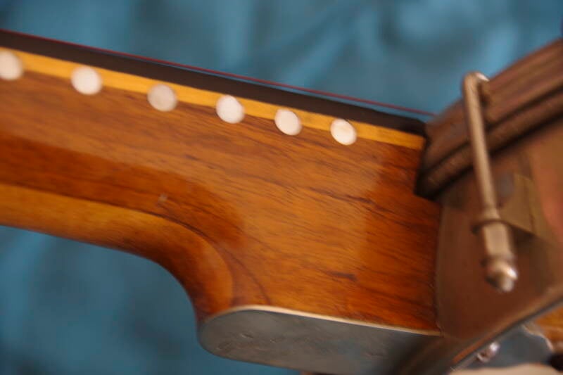 I tune it the Irish way,; G, D, A, E. If I were good enough, I could really rip on this one. Yes, it was old when I was young. And once had a resonator, long lost now.